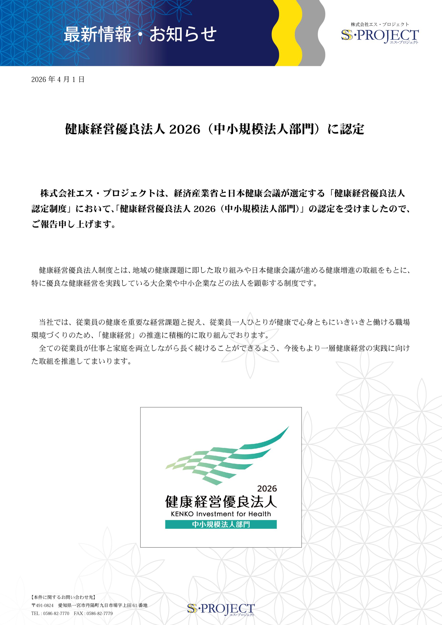 【健康経営優良法人2026(中小規模法人部門)に認定】